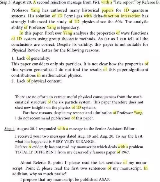 显然,作为国际物理学界的著名刊物,其编辑不识鼎鼎大名的杨振宁是不可能的。但是,即便如此,“一个多月后返回的一位同行评议者认为,新作的结论已经包含在‘同名者(即杨振宁)’在1967年所发表的论文中”。“两天后,另一位同行评议者的反馈传来。反馈的开头是对杨振宁过去工作的肯定,赞扬其分析能力是‘传奇般的’。对于新作,同行评议者表示,据他/她所看,结论都是正确的,但认为这并不合适发表在《物理评论快报》,原因是‘缺乏广泛兴趣’和‘缺少新的物理’”。对此,杨振宁写道,“我不知道是该觉得好笑还是被冒犯”。于是,“杨振宁将该文章投给《中国物理快报》,并在次月(9月)顺利发表”。
